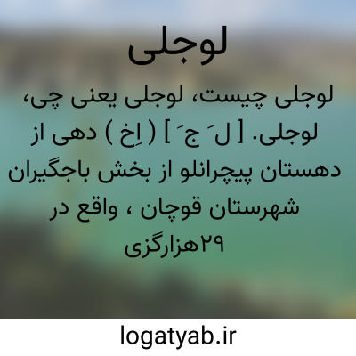 لوجلی. [ ل َ ج َ ] ( اِخ ) دهی از دهستان پیچرانلو از بخش باجگیران شهرستان قوچان، واقع در 29هزارگزی جنوب باختری باجگیران و 21هزارگزی باختر راه شوسه عمومی قوچان به باجگیران. کوهستانی و سردسیر. دارای 5 تن سکنه. آب آن از چشمه. محصول آنجا غلات. شغل اهالی زراعت و صنایع دستی آنان قالیچه و گلیم بافی و راه آن مالرو است. ( از فرهنگ جغرافیائی ایران ج 9 ).