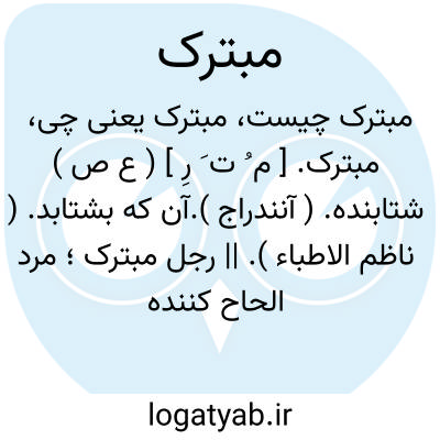 مبترک. [ م ُ ت َ رِ ] ( ع ص ) شتابنده. ( آنندراج ).آن که بشتابد. ( ناظم الاطباء ). || رجل مبترک؛ مرد الحاح کننده معتمد بر چیزی. ( ناظم الاطباء ). || شتر فرو خوابنده. ( ناظم الاطباء ). || آن که به زیر سینه گیرد کسی را. ( آنندراج ). آن که بگیرد کسی را در زیر سینه خود. ( ناظم الاطباء ).