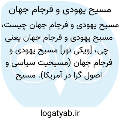 [ویکی نور] مسیح یهودی و فرجام جهان (مسیحیت سیاسی و اصول گرا در آمریکا). مسیح یهودی و فرجام جهان(مسیحیت سیاسی و اصول گرا در آمریکا) ترجمه فارسی «المسیح الیهودی و نهایه العالم» اثر رضا هلال، تحلیلی است درباره دیدگاه های افراطی مسیحیان صهیونیست در آمریکا و بررسی اوضاع جهان در آخرالزمان که به زبان عربی نوشته شده است.
