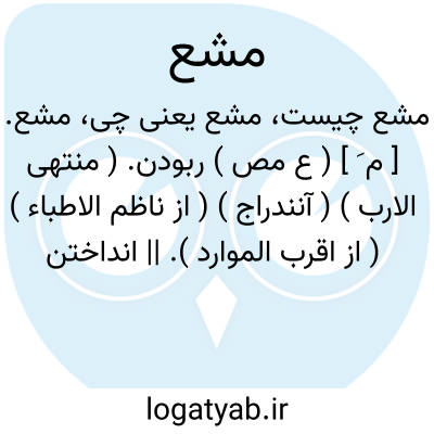 مشع. [ م َ ] ( ع مص ) ربودن. ( منتهی الارب ) ( آنندراج ) ( از ناظم الاطباء ) ( از اقرب الموارد ). || انداختن بول را. ( از منتهی الارب ) ( آنندراج ) ( از اقرب الموارد ). انداختن منی یا بول خویش را. ( ناظم الاطباء ). || سیر آسان و نرم کردن. ( منتهی الارب ) ( آنندراج ). نرم و آسان رفتن. ( ناظم الاطباء ) ( از اقرب الموارد ). || پنبه غاز کردن. ( منتهی الارب ) ( آنندراج ). غاز کردن پنبه را. ( ناظم الاطباء ) ( از اقرب الموارد ). || خیار و مانند آن خائیدن. || گوسفند دوشیدن. ( منتهی الارب ) ( آنندراج ) ( ناظم الاطباء ) ( از اقرب الموارد ). || ورزیدن و گرد آوردن.( منتهی الارب ) ( آنندراج ). ورزیدن و کسب کردن و گرد آوردن. ( ناظم الاطباء ) ( اقرب الموارد ). || به رسن و جز آن زدن. ( منتهی الارب ) ( آنندراج ) ( از اقرب الموارد ). زدن به ریسمان و جز آن. ( ناظم الاطباء ).