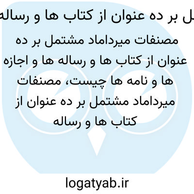 [ویکی نور] مصنفات میرداماد مشتمل بر ده عنوان از کتاب ها و رساله ها و اجازه ها و نامه هامجموعه ارشادات میرداماد که به زبان عربی و فارسی نوشته شده است شامل چند نصیحت از ایشان در خلسه و تبرّی و تولی و نهایتا وصیت نامه میرداماد است.