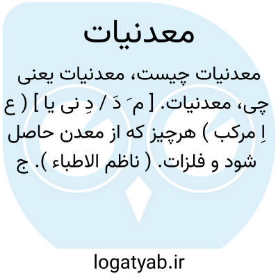 معدنیات. [ م َ دَ / دِ نی یا ] ( ع اِ مرکب ) هرچیز که از معدن حاصل شود و فلزات. ( ناظم الاطباء ). ج ِ معدنیة. اجسام غیرآلی که به درون یا سطح زمین یابند از فلزات و گلهای خوردنی و دارویی و کباریت و املاح و زوابیق و سنگ آهک و سنگ گچ و زغال سنگ و نباتات و حیوانات متحجره و نفت و قیر و مومیایی و جز آن. ( یادداشت به خط مرحوم دهخدا ). و رجوع به معدن شود.