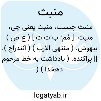 منبث. [ مُم ْ ب َث ث ] ( ع ص ) بیهوش. ( منتهی الارب ) ( آنندراج ). || پراکنده. ( یادداشت به خط مرحوم دهخدا ) ( از منتهی الارب ) ( از اقرب الموارد ): فکانت هباء منبثاً. ( قرآن 6/56 ).