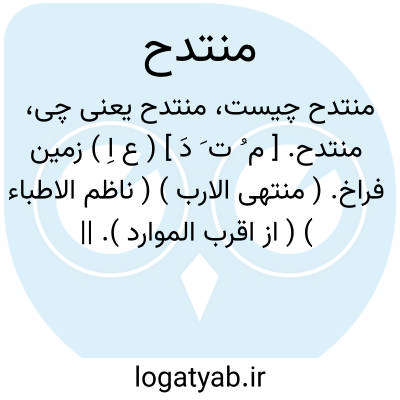 منتدح. [ م ُ ت َ دَ ] ( ع اِ ) زمین فراخ. ( منتهی الارب ) ( ناظم الاطباء ) ( از اقرب الموارد ). || بسیاری وکثرت و وسعت و فراخی. ( ناظم الاطباء ): لی عن هذا الامر منتدح؛ ای سعة. ( منتهی الارب ) ( ناظم الاطباء ). لک منتدح فی البلاد؛ ای مذهب واسع عریض. ( اقرب الموارد ).