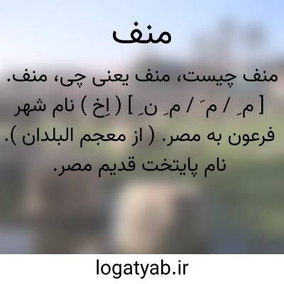 منف. [ م ِ / م َ / م ِ ن ِ ] ( اِخ ) نام شهر فرعون به مصر. ( از معجم البلدان ). نام پایتخت قدیم مصر. ( ناظم الاطباء ). مدینه عین الشمس. در منتهای کوه المقطم در زمان فتح اسلامی خراب شد و مدینه فسطاط را بر آن نهادند. ( یادداشت مرحوم دهخدا ).منفیس. ممفیس. در دوازده میلی فسطاط است. پایتخت قدیم و مرکز علم مصر بود. ( یادداشت ایضاً ): و مولده ( مولد اسقلبیوس ) بمصرفی مدینة منف. ( عیون الانباء ج 1 ص 16 ). رجوع به معجم البلدان و قاموس الاعلام ترکی و منفیس و ممفیس شود.