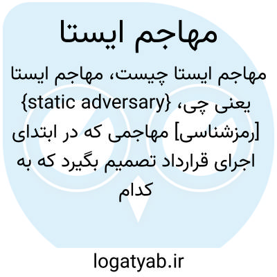 {static adversary} [رمزشناسی] مهاجمی که در ابتدای اجرای قرارداد تصمیم بگیرد که به کدام طرف قرارداد حمله کند