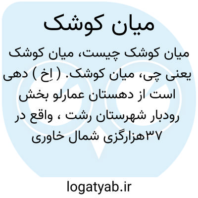 میان کوشک. ( اِخ ) دهی است از دهستان عمارلو بخش رودبار شهرستان رشت، واقع در 37هزارگزی شمال خاوری لوشان با 240 تن سکنه. آب آن از چشمه سار و راه آن مالرو است. ( از فرهنگ جغرافیائی ایران ج 2 ).