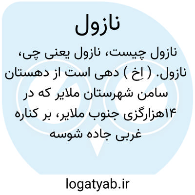 نازول. ( اِخ ) دهی است از دهستان سامن شهرستان ملایر که در 14هزارگزی جنوب ملایر، بر کناره غربی جاده شوسه ملایر به بروجرد، در جلگه معتدل هوای مالاریاخیزی واقع است و 278تن سکنه دارد. آبش از قنات و محصولش غلات دیم و شغل اهالی زراعت و صنعت دستی آنان قالی بافی است. راه اتومبیل رو دارد. ( از فرهنگ جغرافیائی ایران ج 5 ص 450 ).