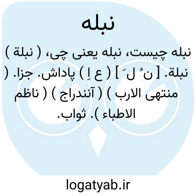( نبلة ) نبلة. [ ن ُ ل َ ] ( ع اِ ) پاداش. جزا. ( منتهی الارب ) ( آنندراج ) ( ناظم الاطباء ). ثواب. جزاء. ( اقرب الموارد ) ( معجم متن اللغة ) ( المنجد ). || عطیه. ( منتهی الارب ) ( آنندراج ) ( ناظم الاطباء ) ( اقرب الموارد ) ( المنجد ). || برگزیده از هر چیزی: نبلة کل شی ٔ؛ خیاره. ( المنجد ) ( اقرب الموارد ) ( از معجم متن اللغة ). || هر چیز که دارای اهمیت باشد.( ناظم الاطباء ). || واحد نُبَل است. ( از المنجد ). بمعنی سنگهای خرد و درشت. رجوع به نبل شود. || لقمه. ( منتهی الارب ) ( آنندراج ) ( ناظم الاطباء ). لقمه کوچک. ( از اقرب الموارد ) ( از معجم متن اللغة ). ج، نُبَل. || سنگ که بدان استنجا کنند. ( غیاث اللغات از شرح نصاب ) ( آنندراج ). سنگ استنجا. ( از معجم متن اللغة ) ( مهذب الاسما ) ( ناظم الاطباء ). کلوخ. کلوخ استنجا. ( ناظم الاطباء ). ما تناولته من مدر او الحجر. || کلوخ کوچک. ( از معجم متن اللغة ). || خمره کوچک. ( ناظم الاطباء ). || هر چیز خرد. ( از معجم متن اللغة ). || ( اِمص ) نجابت. بزرگی. فضل. || آگاهی و تیزی خاطر. ( ناظم الاطباء ). رجوع به نبل شود.