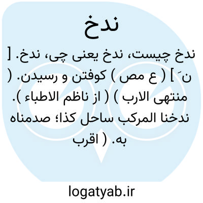 لغت نامه دهخدا ندخ. [ ن َ ] ( ع مص ) کوفتن و رسیدن. ( منتهی الارب ) ( از ناظم الاطباء ). ندخنا المرکب ساحل کذا؛ صدمناه به. ( اقرب الموارد ).