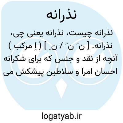 نذرانه. [ ن َ ن َ / ن ِ ] ( اِ مرکب ) آنچه از نقد و جنس که برای شکرانه احسان امرا و سلاطین پیشکش می گذرانند، و هدیه ای که برای بزرگان تقدیم می کنند. || نوعی از مالیات. ( ناظم الاطباء ). || در تداول، نذری. پول یا غذائی که پس از نذر کردن و روا شدن حاجت انفاق کنند.
