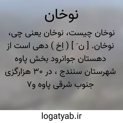 نوخان. [ ن َ ] ( اِخ ) دهی است از دهستان جوانرود بخش پاوه شهرستان سنندج، در 30 هزارگزی جنوب شرقی پاوه و7 هزارگزی مغرب راه پاوه به کرمانشاه، در منطقه کوهستانی سردسیری واقع است و 110 تن سکنه دارد. آبش ازچشمه، محصولش غلات و لبنیات و توتون، شغل مردمش زراعت و گله داری است. ( از فرهنگ جغرافیایی ایران ج 5 ).