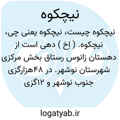 نیچکوه. ( اِخ ) دهی است از دهستان زانوس رستاق بخش مرکزی شهرستان نوشهر. در 48هزارگزی جنوب نوشهر و 12گزی پول، در منطقه کوهستانی سردسیری واقع است و 350 تن سکنه دارد. آبش از چاه و رودخانه محلی، محصولش غلات و ارزن و شغل اهالی زراعت و گله داری است. ( از فرهنگ جغرافیائی ایران ج 3 ).