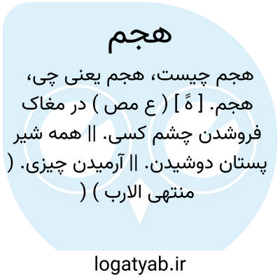 هجم. [ هََ ] ( ع مص ) در مغاک فروشدن چشم کسی. || همه شیر پستان دوشیدن. || آرمیدن چیزی. ( منتهی الارب ) ( اقرب الموارد ). || چشم فروخوابانیدن. ( منتهی الارب ). اطراق. ( اقرب الموارد ). || سکوت. ( اقرب الموارد ). || ویران کردن خانه را. ( منتهی الارب ). هدم. ( اقرب الموارد ). || راندن کسی را. ( منتهی الارب ) ( اقرب الموارد ). || خوی آوردن. ( منتهی الارب ). روان شدن عرق. ( اقرب الموارد ). || زایل و سست شدن بیماری. ( منتهی الارب ). || چهارپا را شدید راندن. ( اقرب الموارد ).