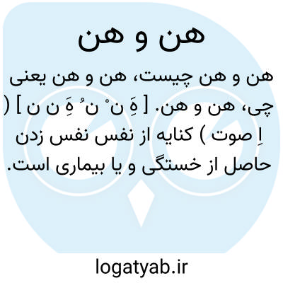 هن و هن. [ هَِ ن ْ ن ُ هَِ ن ن ] ( اِ صوت ) کنایه از نفس نفس زدن حاصل از خستگی و یا بیماری است.