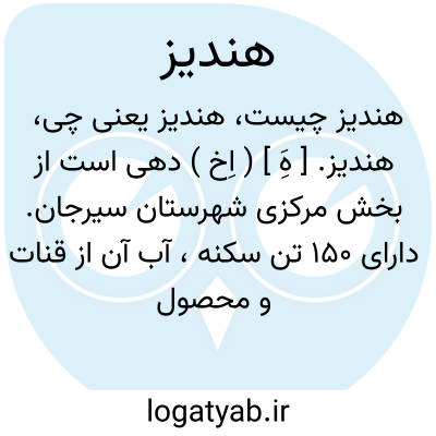 هندیز. [ هَِ ] ( اِخ ) دهی است از بخش مرکزی شهرستان سیرجان. دارای 150 تن سکنه، آب آن از قنات و محصول عمده اش غله، حبوب و میوه است. ( از فرهنگ جغرافیایی ایران ج 8 ).