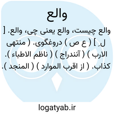 والع. [ ل ِ ] ( ع ص ) دروغگوی. ( منتهی الارب ) ( آنندراج ) ( ناظم الاطباء ). کذاب. ( از اقرب الموارد ) ( المنجد ). دروغ زن. ( مهذب الاسماء ). ج، وَلَعَة. || ولع والع؛ کذب عظیم. ( اقرب الموارد ). دروغ بزرگ. ( ناظم الاطباء ) ( المنجد ). || ( اِ ) کار. ( منتهی الارب ) ( آنندراج ) ( ناظم الاطباء ).