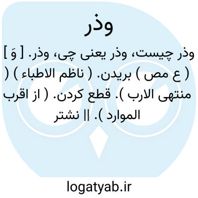 وذر. [ وَ ] ( ع مص ) بریدن. ( ناظم الاطباء ) ( منتهی الارب ). قطع کردن. ( از اقرب الموارد ). || نشتر فروبردن به جراحت. ( منتهی الارب ) ( از اقرب الموارد ) ( ناظم الاطباء ). || بریدن تلاق زن: وذر الوذرة؛ برید تلاق زن را. ( منتهی الارب ) ( از اقرب الموارد ) ( ناظم الاطباء ). || گذاشتن و ترک کردن. ( منتهی الارب ) ( از اقرب الموارد ). || ( اِ ) ج ِ وذرة. ( منتهی الارب ) ( از اقرب الموارد ) ( ناظم الاطباء ). رجوع به وذرة شود.