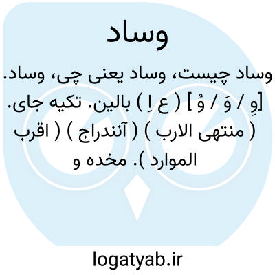 (اسم ) ۱- مخده بالش. ۳- بستر خوابگاه. ۴- مسند اورنگ ((اثری از آثار معالم علم اگر امروز نشان میدهند جر برسد. سیادت و وساده حشمت اوصورت پذیرنیست. ) ) جمع: وسادات.