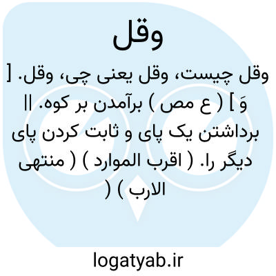 وقل. [ وَ ق َ ] ( ع اِ ) سنگریزه. || شاخ بریده که بن آن در تنه باقی باشد و بدان به خوبی بر درخت برآمدن توانند. ( منتهی الارب ). || ( ص ) ( فرس... ) اسب نیکو برآینده بر کوه. ( اقرب الموارد ) ( آنندراج ). بز کوهی که بر سر کوه شود. ( مهذب الاسماء ).