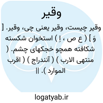 وقیر. [ وَ ] ( ع ص، اِ ) استخوان شکسته شکافته همچو خجکهای چشم. ( منتهی الارب ) ( آنندراج ) ( اقرب الموارد ). || گو کلان درسنگ که آب گرد آید در وی، و مغاکی در کوه. ( منتهی الارب ) ( آنندراج ) ( از اقرب الموارد ). وقیرة. ( منتهی الارب ) ( آنندراج ). || گله گوسفندان یا گوسفندان ریزه یا گله پنجصد گوسفند، یا عام است، یا گوسفندان مع سگ و خر و شبان آن. ( منتهی الارب ) ( آنندراج ).گوسفندی بسیار. ( مهذب الاسماء ) ( از اقرب الموارد ).