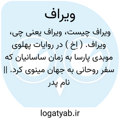 ویراف. ( اِخ ) در روایات پهلوی موبدی پارسا به زمان ساسانیان که سفر روحانی به جهان مینوی کرد. || نام پدر اردای پیغمبر است ( برهان ) ( آنندراج )، اما گفته این دو فرهنگ بر اساسی نیست. رجوع به ارداویراف شود.