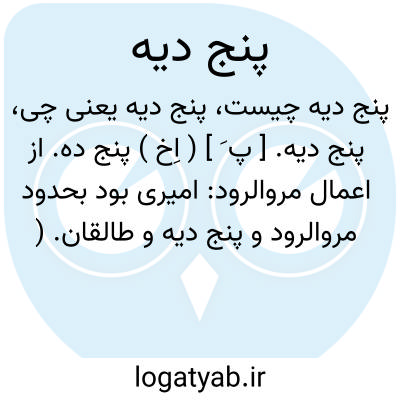 پنج دیه. [ پ َ ] ( اِخ ) پنج ده. از اعمال مروالرود: امیری بود بحدود مروالرود و پنج دیه و طالقان. ( جهانگشای جوینی ). رجوع به پنج ده شود.