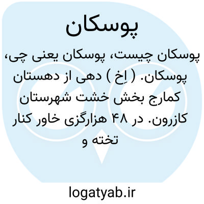 پوسکان. ( اِخ ) دهی از دهستان کمارج بخش خشت شهرستان کازرون. در 48 هزارگزی خاور کنار تخته و دامنه جنوبی کوه سلب. کوهستانی، گرمسیر، مالاریائی، دارای 83 تن سکنه، فارسی زبان.آب آن از چشمه، محصول آنجا غلات، شغل اهالی زراعت، راه آن مالرو است. ( از فرهنگ جغرافیائی ایران ج 7 ).