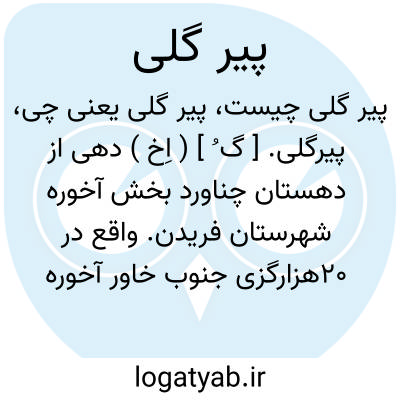 پیرگلی. [ گ ُ ] ( اِخ ) دهی از دهستان چناورد بخش آخوره شهرستان فریدن. واقع در 20هزارگزی جنوب خاور آخوره و 12هزارگزی راه عمومی مالرو. کوهستانی، سردسیر. دارای 413 تن سکنه. آب آن از چشمه. محصول آنجا غلات و حبوبات و تریاک و پشم و روغن. شغل اهالی زراعت و گله داری راه آن مالرو است. ( فرهنگ جغرافیایی ایران ج 10 ).