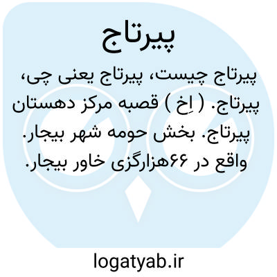 پیرتاج. ( اِخ ) قصبه مرکز دهستان پیرتاج. بخش حومه شهر بیجار. واقع در 66هزارگزی خاور بیجار. کوهستانی، سردسیر. دارای 1500 تن سکنه. آب آن از چشمه و قنات، محصول آنجا غلات و میوه و انگور فراوان و قلمستان و لبنیات. شغل اهالی زراعت، گله داری و باغبانی. صنایع دستی زنان، قالیچه و جاجیم بافی. راه آن مالرو است. در فصل خشکی از طریق خانباغی اتومبیل میتوان برد. دبستان، پاسگاه ژاندارمری و 5 باب دکان دارد. ( فرهنگ جغرافیایی ایران ج 5 ).