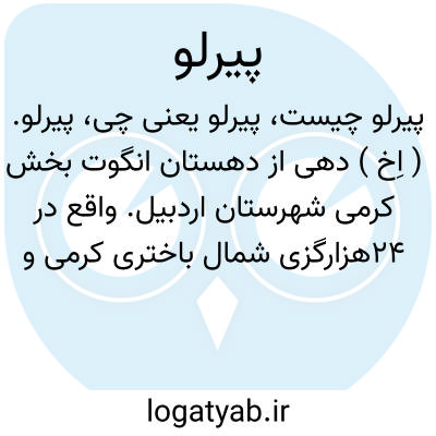پیرلو. ( اِخ ) دهی از دهستان انگوت بخش کرمی شهرستان اردبیل. واقع در 24هزارگزی شمال باختری کرمی و 14هزارگزی شوسه کرمی به اردبیل.جلگه، گرمسیر، دارای 140 تن سکنه. آب آن از چشمه. محصول آنجا غلات و حبوبات. شغل اهالی زراعت و گله داری و راه آن مالرو است. ( فرهنگ جغرافیایی ایران ج 4 ).