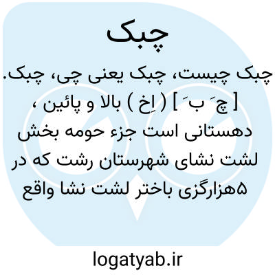 چبک. [ چ َ ب َ ] ( اِخ ) بالا و پائین، دهستانی است جزء حومه بخش لشت نشای شهرستان رشت که در 5هزارگزی باختر لشت نشا واقع شده. جلگه و مرطوبست و 970 تن سکنه دارد. آبش از نورود و سفیدرود. محصولش برنج، شغل اهالی زراعت و مکاری و راهش مالرو است. در اصطلاح اهالی چبک پائین به سمیعی و چبک بالا به شفیعی معروف است. ( از فرهنگ جغرافیایی ایران ج 2 ).