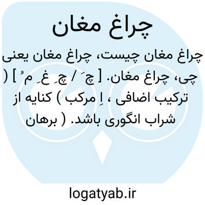 چراغ مغان. [ چ َ / چ ِ غ ِ م ُ ] ( ترکیب اضافی، اِ مرکب ) کنایه از شراب انگوری باشد. ( برهان ). کنایه از شراب صاف بود. ( انجمن آرا ) ( آنندراج ). شراب. ( مجموعه مترادفات ص 224 ) ( ناظم الاطباء ).