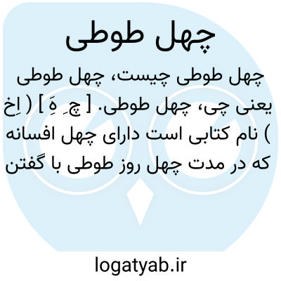 چهل طوطی. [ چ ِ هَِ ] ( اِخ ) نام کتابی است دارای چهل افسانه که در مدت چهل روز طوطی با گفتن یکی از آنها بانوی خانه را که قصد فساد دارد مشغول میدارد تاخواجه وی از سفر بازمیگردد. ( از یادداشت مؤلف ).