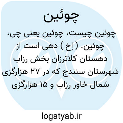چوئین. ( اِخ ) دهی است از دهستان کلاترزان بخش رزاب شهرستان سنندج که در 27 هزارگزی شمال خاور رزاب و 15 هزارگزی جنوب شوسه سنندج به مریوان واقع است. کوهستانی و سردسیر است. 220 تن سکنه دارد. ازرودخانه و چشمه آبیاری میشود. محصولاتش غلات و لبنیات و توتون است. مردمش بزراعت و گله داری اشتغال دارند.راهش مالرو است. ( از فرهنگ جغرافیایی ایران ج 5 ).