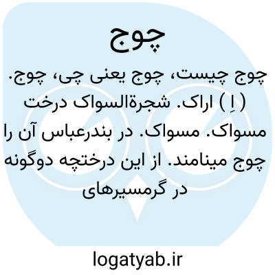 چوج. ( اِ ) اراک. شجرةالسواک درخت مسواک. مسواک. در بندرعباس آن را چوج مینامند. از این درختچه دوگونه در گرمسیرهای جنوب ایران بحال وحشی دیده میشود. از قبیل گااوما در بندرعباس و قسمی که در چاه بهار است. و میوه آن به کباث موسوم است. ( یادداشت مؤلف ). درختچه ای است که در کرانه های جنوب و نقاط گرمسیری ایران یافت میشود و نام علمی آن سلواد وراپرسیکا است. ( گیاه شناسی تألیف کریم ساعی ج 1 ص 274 ). چوج.