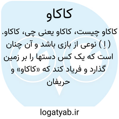 کاکاو. ( اِ ) نوعی از بازی باشد و آن چنان است که یک کس دستها را بر زمین گذارد و فریاد کند که «کاکاو» و حریفان دیگر از اطراف او درآمده او را در باد شلاق گیرند، او همان طریق دست بر زمین نهاده از عقب حریفان دود و به هر کس که سر پای خود را برساند او را بجای خود آورد.( برهان ) ( آنندراج ) ( شعوری ج 2 ورق 256 ):