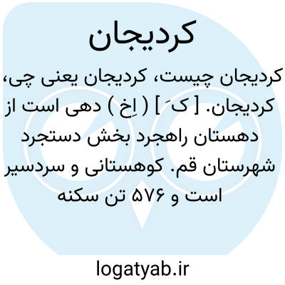 کردیجان. [ ک َ ] ( اِخ ) دهی است از دهستان راهجرد بخش دستجرد شهرستان قم. کوهستانی و سردسیر است و 576 تن سکنه دارد. مزارع کلوماران، پهلوان آباد و تبریزآبادجزء این ده است. ( از فرهنگ جغرافیایی ایران ج 1 ).