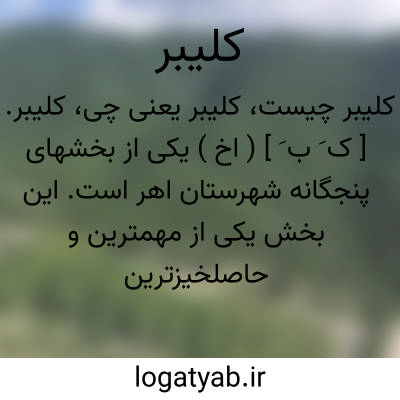 کلیبر. [ ک َ ب َ ] ( اِخ ) قصبه مرکز بخش و همچنین دهستان کلیبر از شهرستان اهر است. در 24 هزارگزی شمال اهر در انتهای جاده شوسه اهر به کلیبر واقع است. مختصات جغرافیایی آن به شرح زیر است: طول 30 درجه و 47 دقیقه، عرض 46 درجه و 5 دقیقه و 38 ثانیه. اختلاف ساعت با تهران 17 دقیقه و 32 ثانیه یعنی 12 ظهر کلیبر ساعت 12 و 17 دقیقه و 32 ثانیه تهران است. کوهستانی و گرمسیر است و 1829 تن سکنه دارد. آب از رودخانه کلیبر و دو رشته چشمه تأمین می شود. ( از فرهنگ جغرافیایی ایران ج 4 ).
