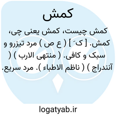 کمش. [ ک َ ] ( ع ص ) مرد تیزرو و سبک و کافی. ( منتهی الارب ) ( آنندراج ) ( ناظم الاطباء ). مرد سریع. ( از اقرب الموارد ). || اسب خردنره. ( منتهی الارب ) ( آنندراج ). اسب نریان خردنره. ( ناظم الاطباء ). || زن خردپستان. ( منتهی الارب ) ( آنندراج ). || مادیان خردپستان.( ناظم الاطباء ). اسب خردپستان. ( از اقرب الموارد ).