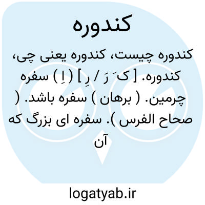 کندوره. [ ک َ رَ / رِ ] ( اِ ) سفره چرمین. ( برهان ) سفره باشد. ( صحاح الفرس ). سفره ای بزرگ که آن را دستار خوان می گویند. ( آنندراج ) ( انجمن آرا ). دستار خوان. سفره. کندوری.( یادداشت به خط مرحوم دهخدا ). || پیش انداز و آن پارچه ای باشد که در پیش سفره و بر روی زانوی مردم بگسترانند تا چیزی از خوردنی بر زمین و دامن مردم نریزد و این رسم در ملک روم جاری است. ( برهان ) ( ناظم الاطباء ). || میز بزرگ. ( ناظم الاطباء ) ( از اشتینگاس ). || خوان کلان. ( ناظم الاطباء ). || کندو. کنور. کندوله. خم از گل کرده که غله در آن ریزند. ( یادداشت به خط مرحوم دهخدا ).