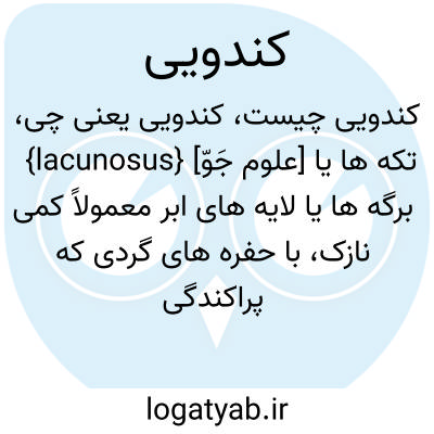 {lacunosus} [علوم جَوّ] تکه ها یا برگه ها یا لایه های ابر معمولاً کمی نازک، با حفره های گردی که پراکندگی نسبتاً منظمی دارند و بیشتر آنها دارای لبه های نواری هستند؛ اجزای ابر و فضاهای خالی میان آنها اغلب به گونه ای قرار گرفته است که به صورت شبکه یا کندو دیده می ش...