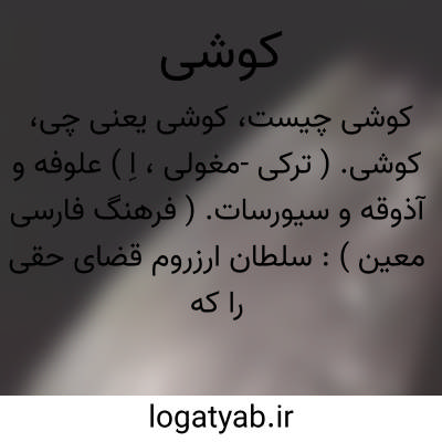 کوشی. ( ترکی -مغولی، اِ ) علوفه و آذوقه و سیورسات. ( فرهنگ فارسی معین ): سلطان ارزروم قضای حقی را که او وقت محاصره اخلاط به مدد علوفه و کوشی نشانده، به انواع مبرات و کرامات مخصوص شد. ( تاریخ جهانگشا ج 2 ص 181 از فرهنگ فارسی معین ).