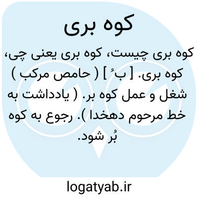 لغت نامه دهخدا کوه بری. [ ب ُ ] ( حامص مرکب ) شغل و عمل کوه بر. ( یادداشت به خط مرحوم دهخدا ). رجوع به کوه بُر شود.