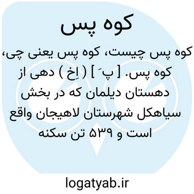 کوه پس. [ پ َ ] ( اِخ ) دهی از دهستان دیلمان که در بخش سیاهکل شهرستان لاهیجان واقع است و 539 تن سکنه دارد. ( از فرهنگ جغرافیایی ایران ج 2 ).