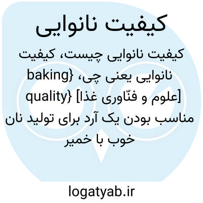 {baking quality} [علوم و فنّاوری غذا] مناسب بودن یک آرد برای تولید نان خوب با خمیر ورآمده و بافت دلخواه و توزیع یکنواخت حباب های هوای تشکیل شده در حین تخمیر
