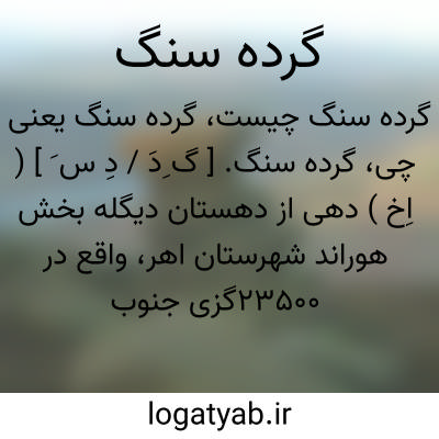 گرده سنگ. [ گ ِدَ / دِ س َ ] ( اِخ ) دهی از دهستان دیگله بخش هوراند شهرستان اهر، واقع در 23500گزی جنوب هوراند و 3هزارگزی راه شوسه اهر به کلیبر. هوای آن معتدل و دارای 301 تن سکنه است. آب آنجا از چشمه تأمین میشود. محصول آن غلات و حبوبات. شغل اهالی زراعت و گله داری و راه آن مالرو است. ( از فرهنگ جغرافیایی ایران ج 4 ).
