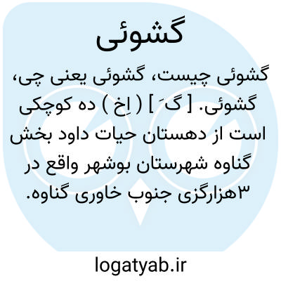گشوئی. [ گ َ ] ( اِخ ) ده کوچکی است از دهستان حیات داود بخش گناوه شهرستان بوشهر واقع در 3هزارگزی جنوب خاوری گناوه. دارای 50 تن سکنه است. ( از فرهنگ جغرافیایی ایران ج 7 ).