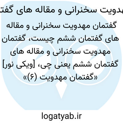[ویکی نور] «گفتمان مهدویت (6)» مجموعه سخنرانی ها، تحلیل ها و مقالات تحقیقی راجع به آموزه مهدویت و دفاع از این عقیده اصیل اسلامی شیعی است.