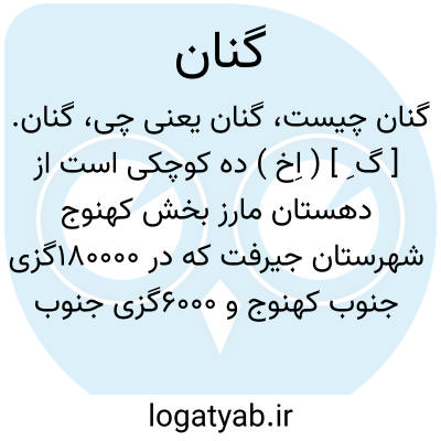 گنان. [ گ ِ ] ( اِخ ) ده کوچکی است از دهستان مارز بخش کهنوج شهرستان جیرفت که در 180000گزی جنوب کهنوج و 6000گزی جنوب راه مالرو رمشک به مارز واقع شده است. سکنه آن 20 تن است. ( از فرهنگ جغرافیایی ایران ج 8 ).